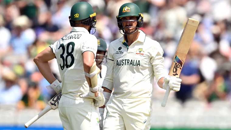 آسٹریلیا کی جانب سے عثمان خواجہ اور مارنوس لبوشین نے اننگز کا آغاز کیا تاہم خواجہ کھاتہ کھولے بغیر ہی پویلین واپس لوٹ گئے جبکہ لبوشین 17 رنز بناکر آؤٹ ہوئے، تیسرے نمبر پر آنے والے کیمرون گرین 4 رنز کے مہمان ثابت ہوئے اور ٹرویس ہیڈ 11 رنز بنانے کے بعد پویلین واپس لوٹ گئے۔