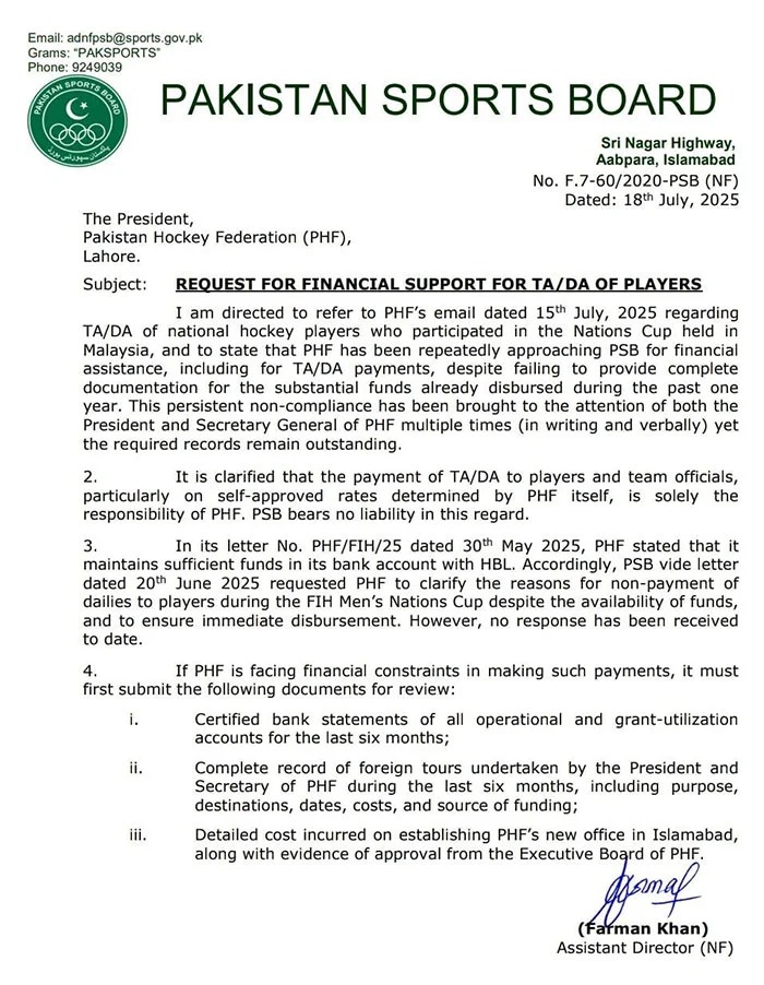 خط میں ملائشیا میں منعقدہ نیشنز کپ میں قومی کھلاڑیوں کو ٹی اے ڈی اے دیئے جانے کے حوالے سے ذکر کرتے ہوئے کہا گیا ہے کہ پی ایچ ایف گزشتہ برس دیے جانے والے فنڈز کے حوالے سے تفصیلات اب تک فراہم نہیں کرسکا،