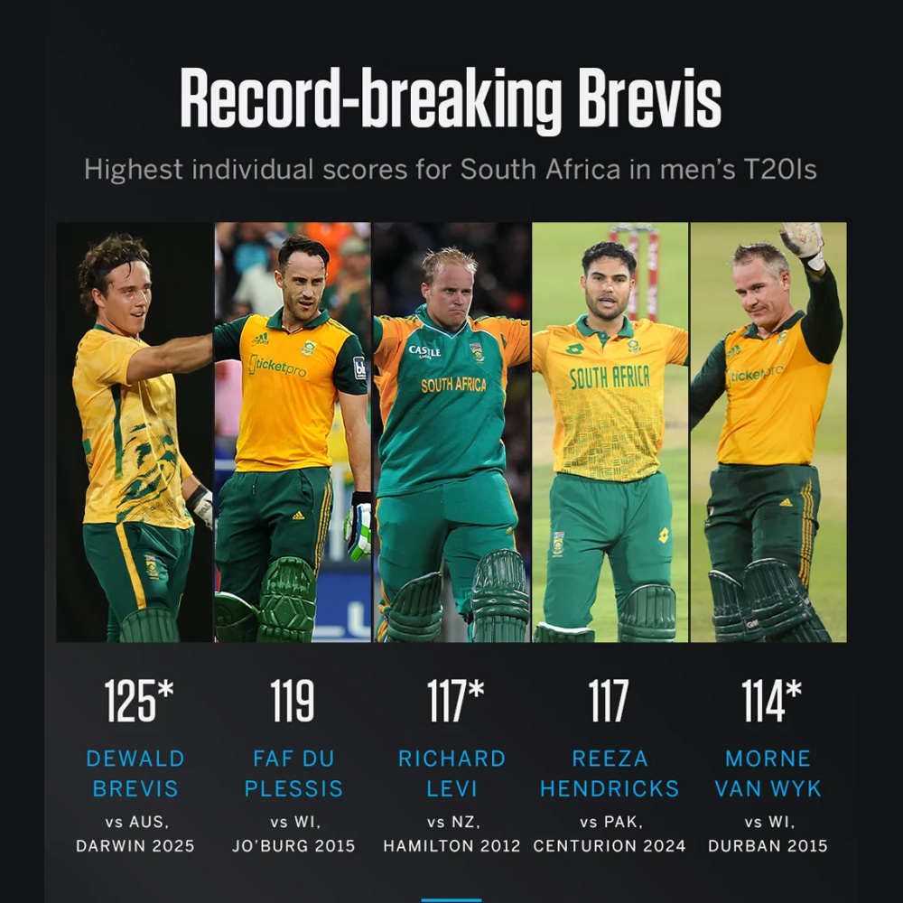 اس برق رفتار اننگز کے ساتھ ہی بریوس نے نئی تاریخ رقم کی اور وہ جنوبی افریقا کے لیے ٹی 20 انٹرنیشنل میں سب سے بڑا انفرادی سکور کرنے والے بیٹر بن گئے۔