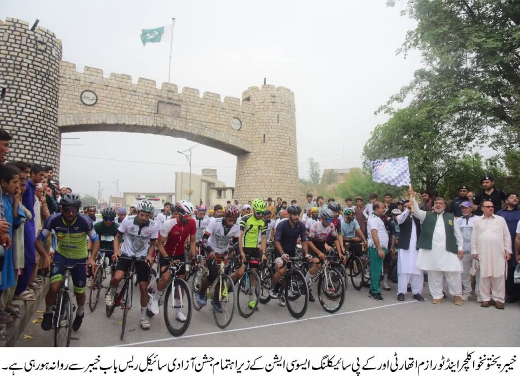 آزادی فیسٹول تقریب کے سلسلے میں صوبائی سائیکلنگ ایسوسی ایشن کے تعاون سے منعقدہ سائیکل ریس باب خیبر سے شروع ہوکر پشاور سپورٹس کمپلیکس میں اختتام پذیر ہوئی ، سائیکل ریس میں سوسے زائد سائیکلسٹ نے حصہ لیا ،
