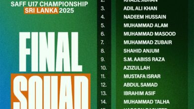 ساٖف انڈر-17 چیمپئن شپ 2025 ; قومی اسکواڈ کا اعلان پاکستان فٹبال فیڈریشن نے سری لنکا میں 15 سے 27…